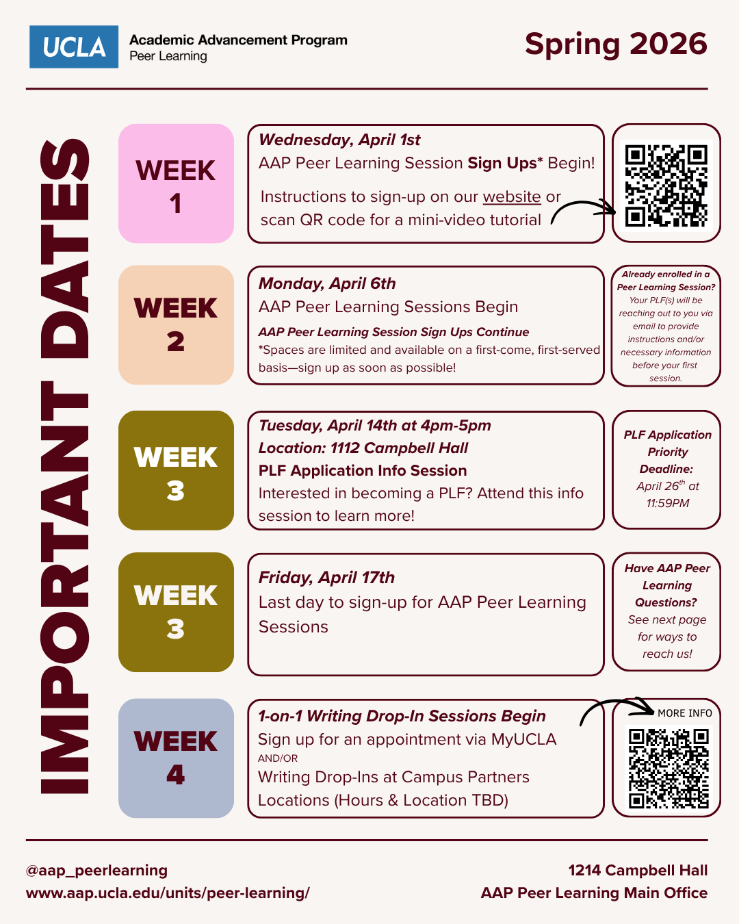 AAP Peer Learning sign-ups are done through MyUCLA following the Peer Learning pass system protocol. In addition, you will receive a notification via MyUCLA to remind you of enrollment passes during Week 1. Please review the following link for additional information about online sign-ups: https://www.aap.ucla.edu/units/peer-learning/#online-sign-ups. Although the Peer Learning Unit Administrative Team will be available for in-person support based on a hybrid schedule during Spring 2026, we will always be responding to email messages and phone requests as much as possible.
