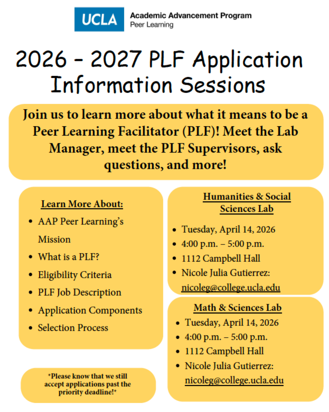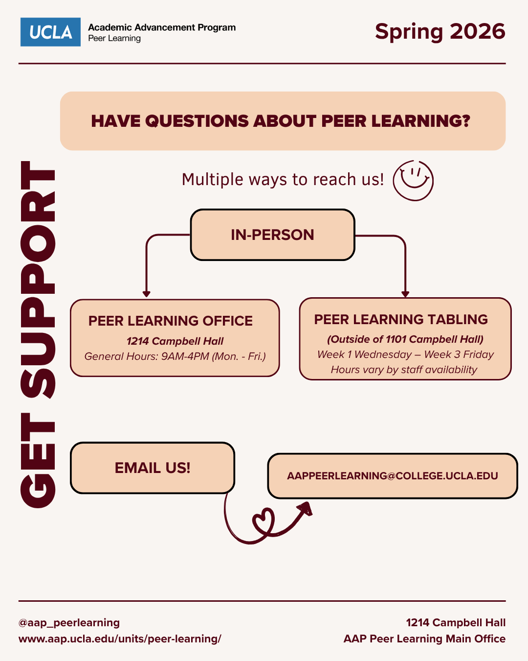 If you have questions regarding the AAP Peer Learning Unit, please do not hesitate to stop by our main office at 1214 Campbell Hall or email us at aappeerlearning@college.ucla.edu.