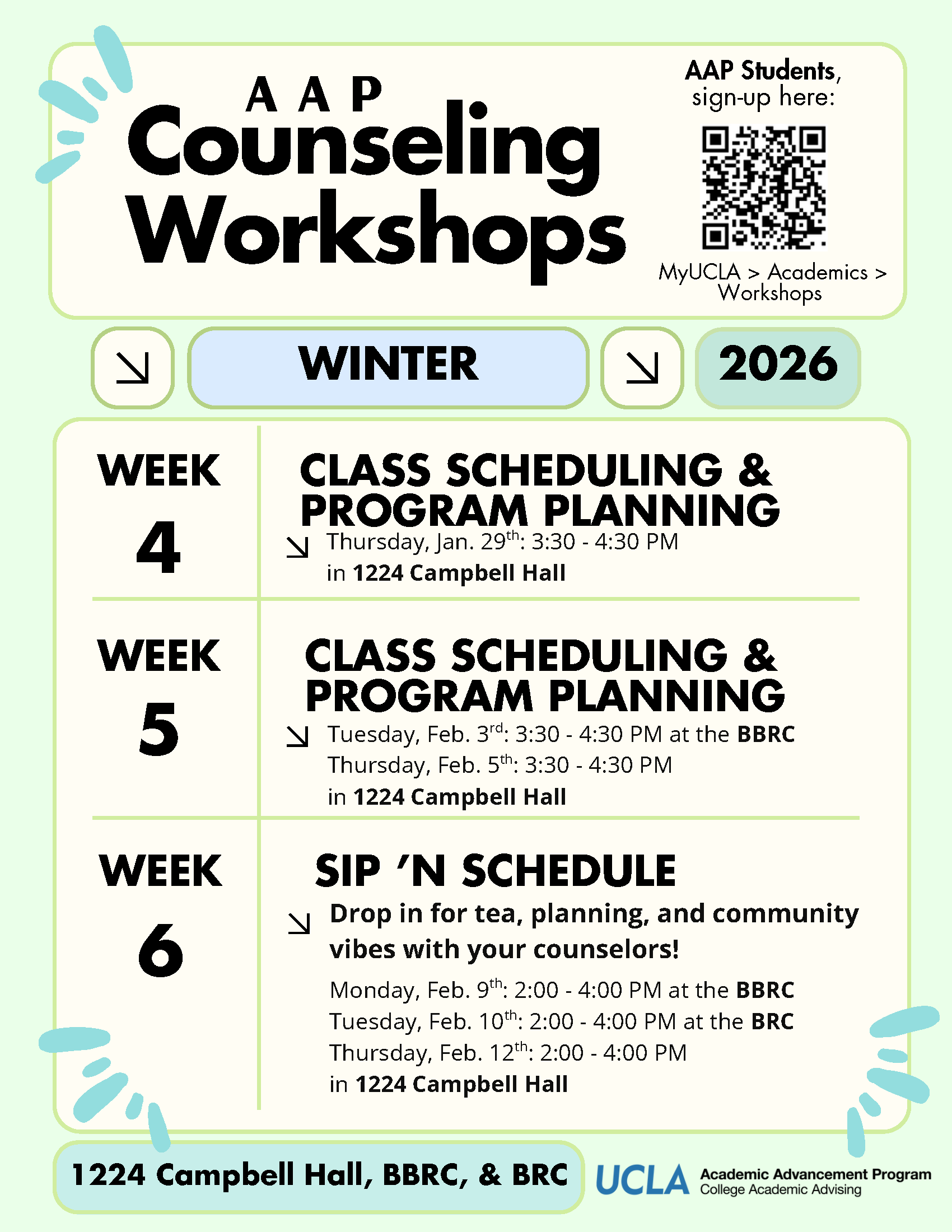 AAP addresses the specific needs of its target population. It is very important that you frequent our office to meet with an AAP College Counselor, or process UCLA College petitions and related requests. All AAP College Counselors are available for scheduled in-advance or same-day appointments. Please visit the AAP Counseling Hub at 1205 Campbell Hall to schedule a time to meet with your AAP Counselor or Peer Counselor.