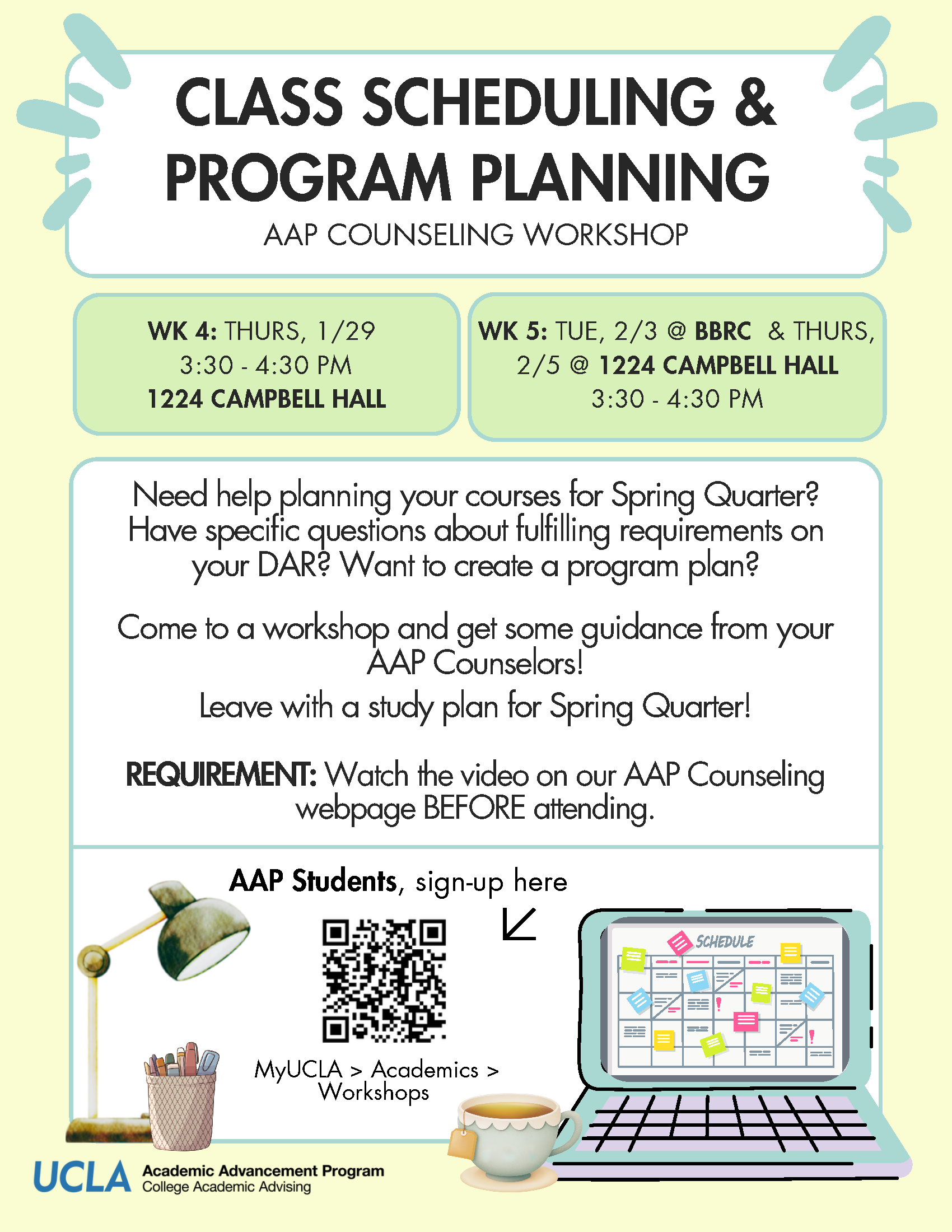 If you are an undergraduate student in the Academic Advancement Program, we encourage you to use these pages to educate yourself about the rules affecting your academic career, and to explore the many resources available to you in AAP and at UCLA in general. Because each student’s situation is unique, this site should supplement, rather than replace, meetings with your AAP College Counselor.