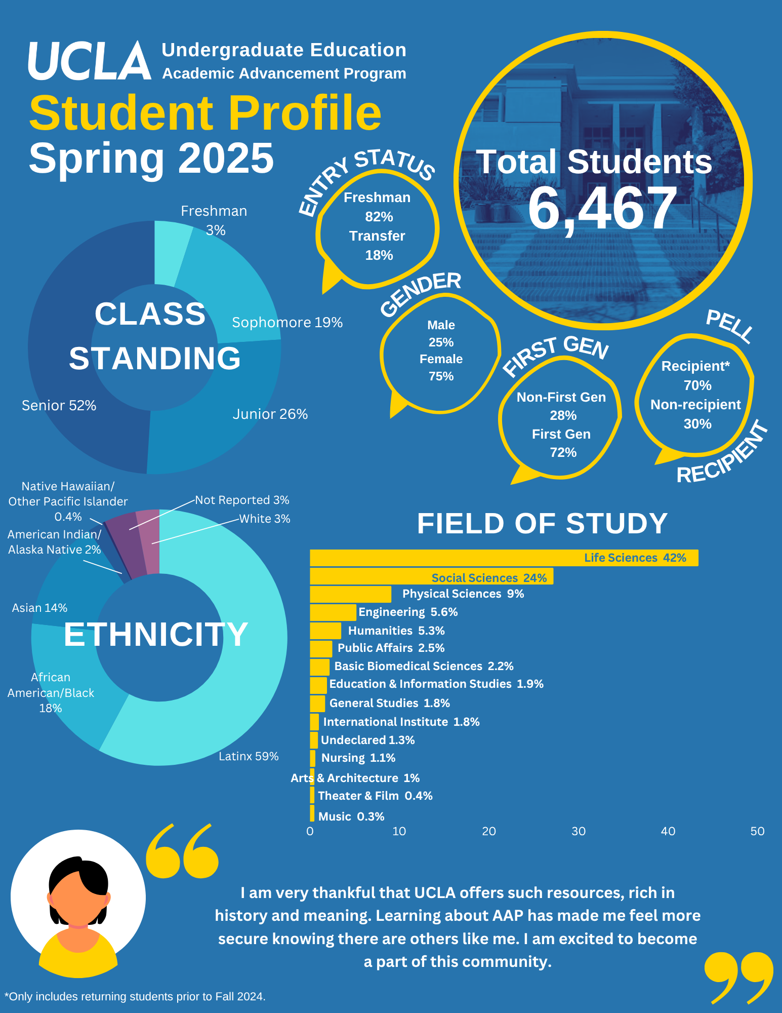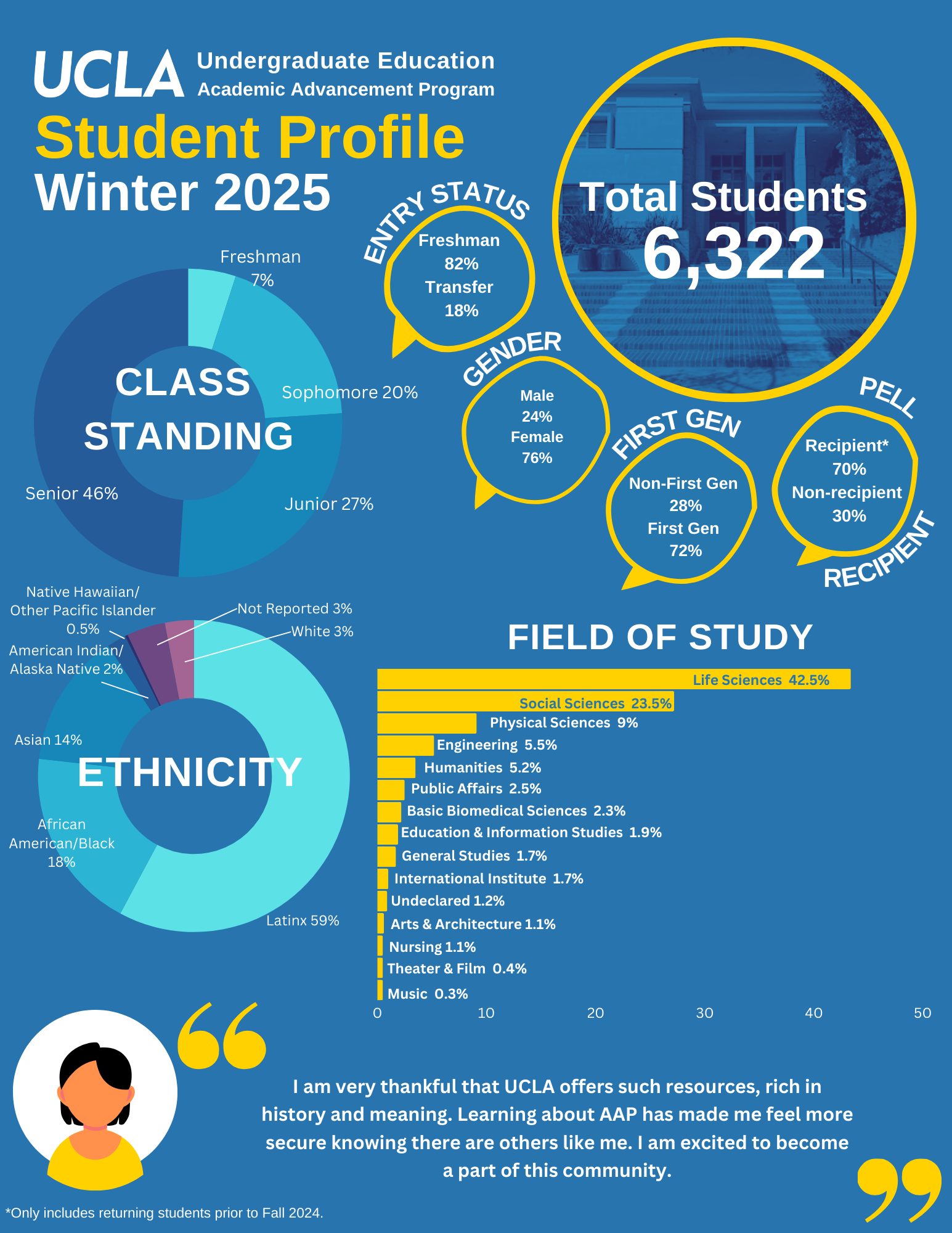 Interested in AAP? Want to know more about AAP and our students and programs? Looking to collaborate with AAP? AAP’s Research, Evaluation and Assessment unit accepts data requests from UCLA campus stakeholders seeking information about AAP students and programs. To submit a data request, please access our data request form below. For questions about data availability, please email us.